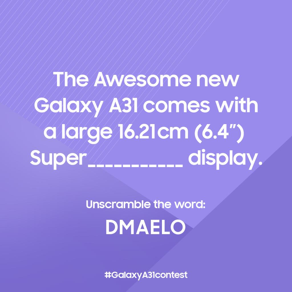 - The all-new #GalaxyA31 is finally here! Unscramble the word, answer the question and stand...