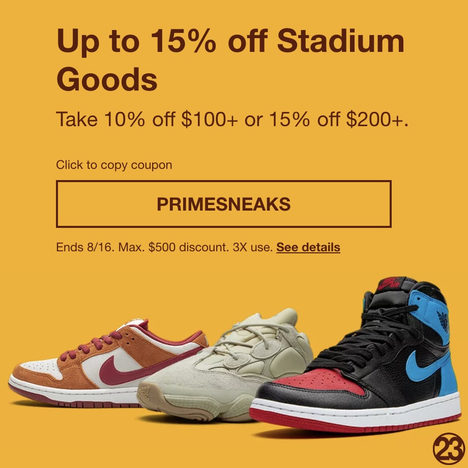 - Up to 15% OFF on Stadium Goods eBay store with code PRIMESNEAKS Shop Jordan...