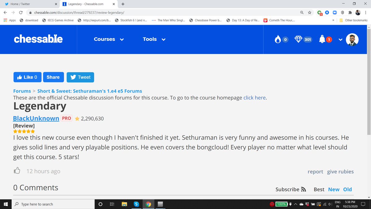 | Thanks for the heartening comments from the readers 😊 Hope everyone out there is... Posted: 23 Oct 2020 05:17 AM PDT RT @sethuramanchess Thanks for the heartening comments from the readers 😊 Hope everyone out there is enjoying the course :) #LifetimeRepotire #1e4e5 #chessable This posting includes an audio/video/photo media file: Download Now |