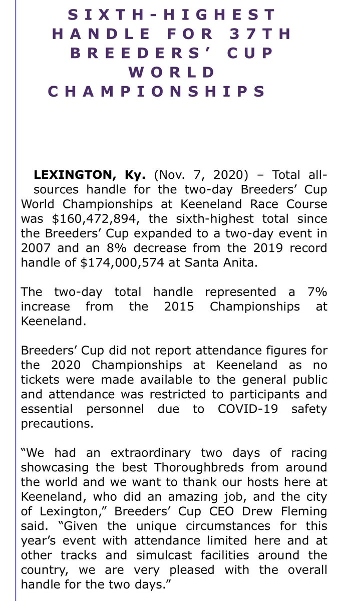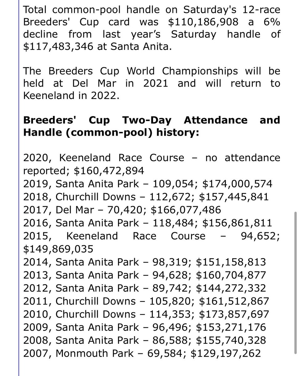 - NEWS: Total all-sources handle for the two-day Breeders' Cup World Championships at @keenelandracing was...