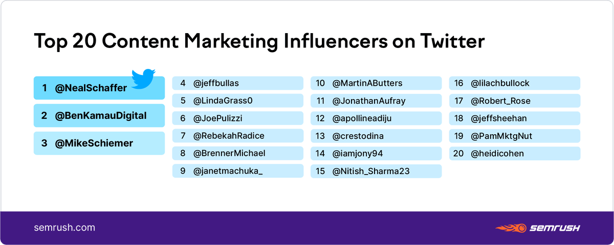 | Posted: 05 Dec 2020 07:20 AM PST RT @semrush Top 10 Content Marketing Influencers on Twitter @NealSchaffer @BenKamauDigital @MikeSchiemer @jeffbullas @LindaGrass0 @JoePulizzi @RebekahRadice @BrennerMichael @janetmachuka_ @MartinAButters More #Content trends in our new study 馃憠 bit.ly/2VtNGLM |