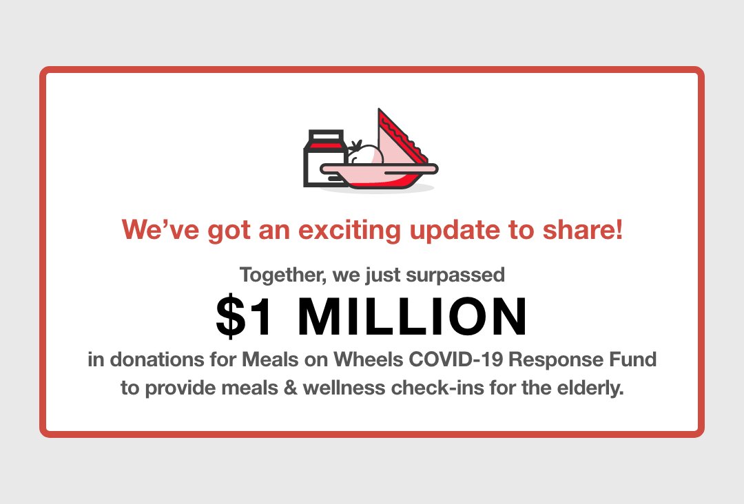 - We're thrilled to announce we have just surpassed $1 million for @_mealsonwheels COVID-19 Response...