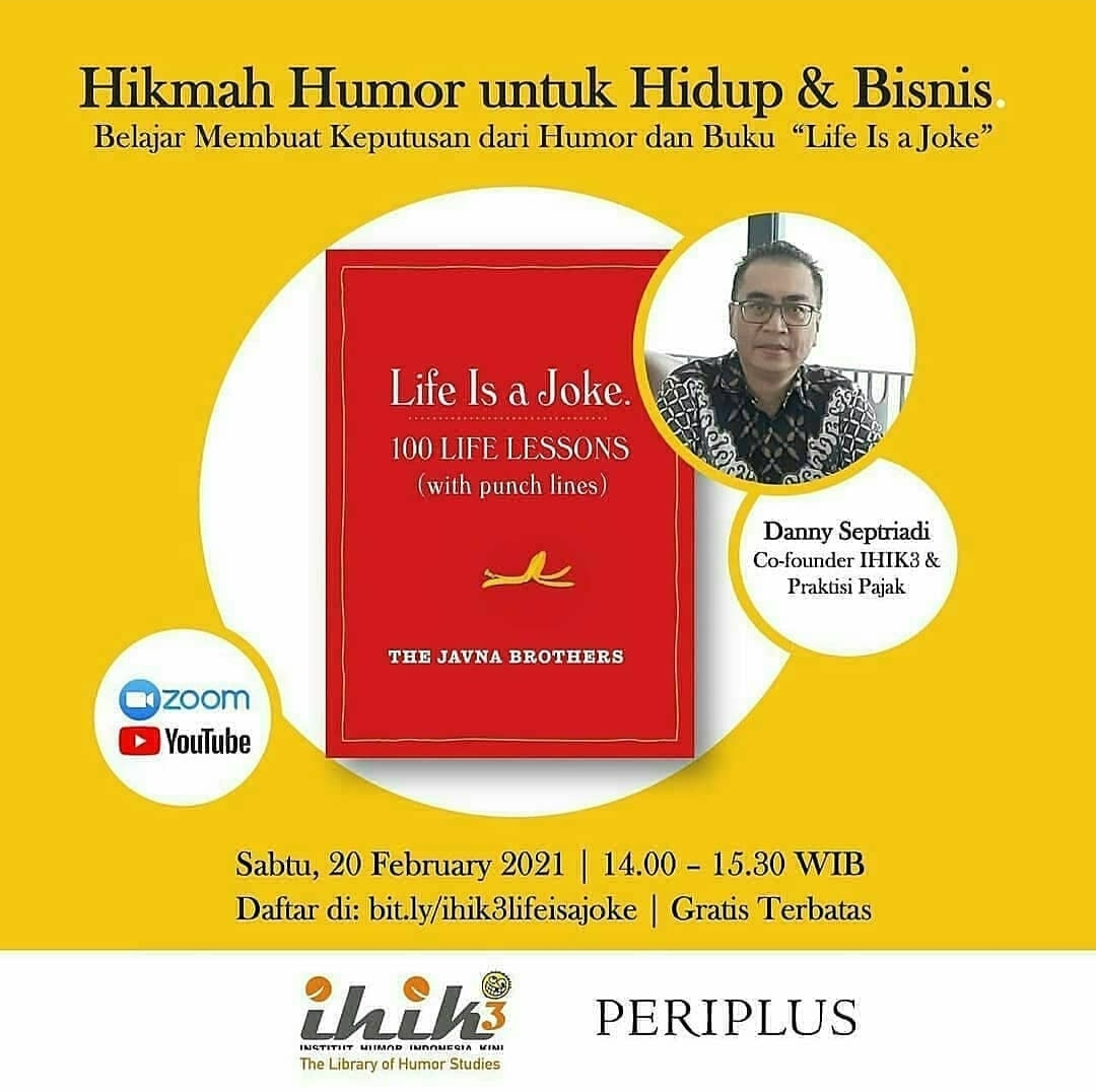 | ⚡Yuk tambah Ilmu! Belajar membuat keputusan dari humor dan buku "Life is a Joke"... Posted: 14 Feb 2021 08:31 PM PST ⚡Yuk tambah Ilmu! Belajar membuat keputusan dari humor dan buku "Life is a Joke" bersama Bpk. Danny Septriadi, Co-founder @IHIK3 & Praktisi Pajak. Dijamin Seru!!! Daftar gratis disini: is.gd/WYnKpK #TambahIlmu #DiskusiBuku #Periplus #Indonesia This posting includes an audio/video/photo media file: Download Now |