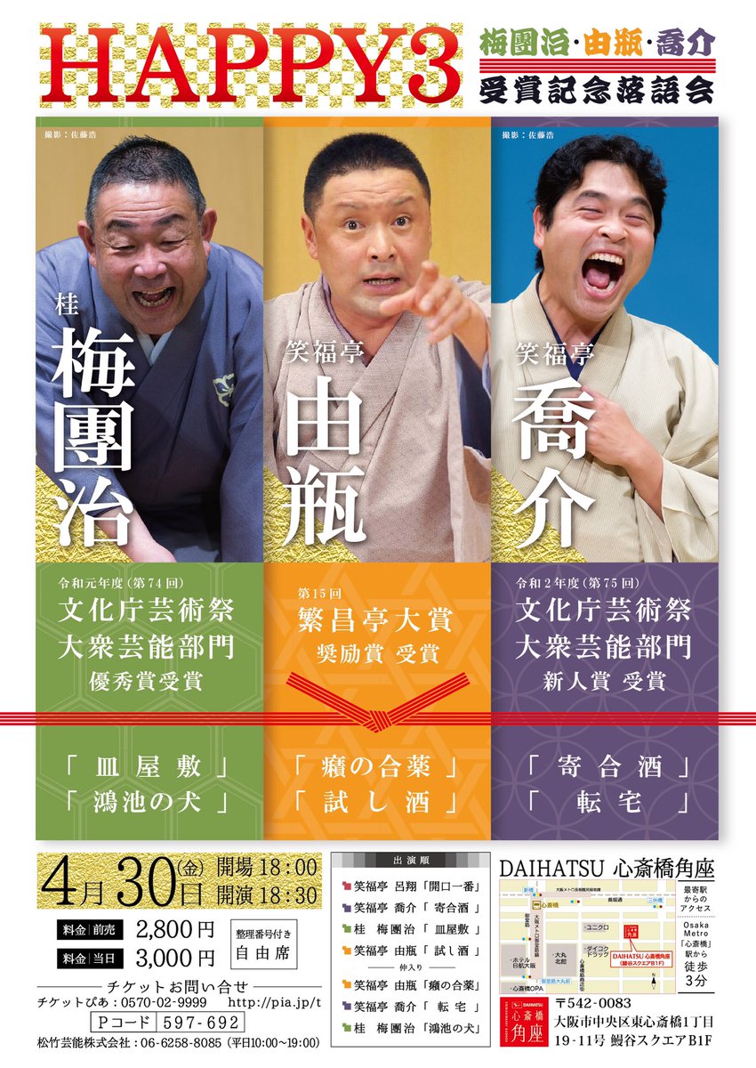 - ㊗️本日チケット発売㊗️ 4月30日(金)18:30開演(18時開場) 梅團治・由瓶・喬介受賞記念落語会 「HAPPY3」 ▶︎出演 桂梅團治「皿屋敷」「鴻池の犬」 笑福亭由瓶「癪の合薬」「試し酒」 笑福亭喬介「寄合酒」「転宅」 笑福亭呂翔「開口一番」 ▶︎料金 前売280...