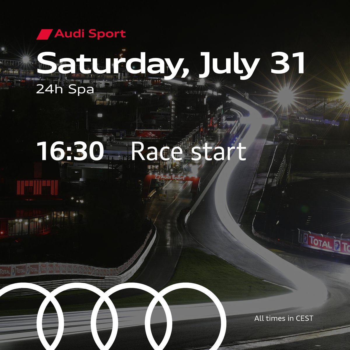 | It's RACE DAY! The world's biggest GT3 race will go green at 16:30 CEST.... Posted: 31 Jul 2021 12:10 AM PDT It's RACE DAY! The world's biggest GT3 race will go green at 16:30 CEST. >> audi.com/GT3 #PerformanceIsAnAttitude #GT3 #Spa24h |
