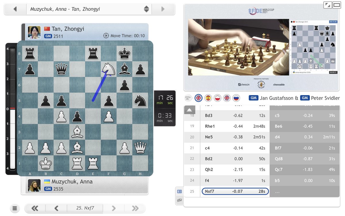 - Muzychuk-Tan Zhongyi is really heating up, with Anna down to under a minute! Peter...