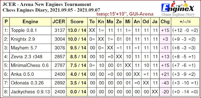 - Topple 0.8.1 wins JCER - Arena New Engines Tournament, 2021.09.05 - 2021.09.07 chessengines.blogspot.com/2021/09/topple…