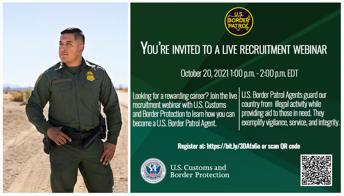 | Interested in learning what it takes to become a Border Patrol Agent? Join us... Posted: 18 Oct 2021 06:09 AM PDT Interested in learning what it takes to become a Border Patrol Agent? Join us for a LIVE webinar October 20, 1-2pm EDT to learn how to start your career with U.S. Customs and Border Protection. Register today at bit.ly/3DAfa6o This posting includes an audio/video/photo media file: Download Now |