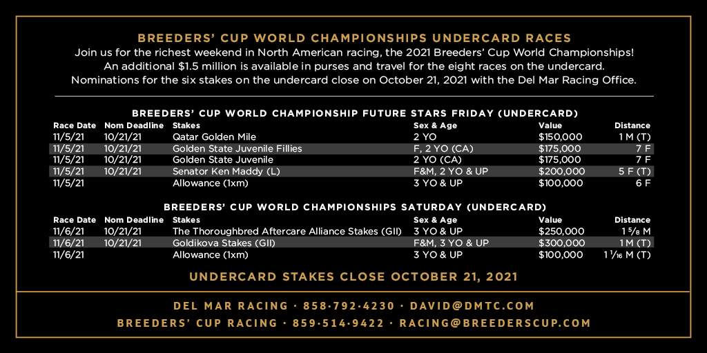 - 🚨 Nominations for the six stakes on the #BreedersCup undercard closes TODAY with the...