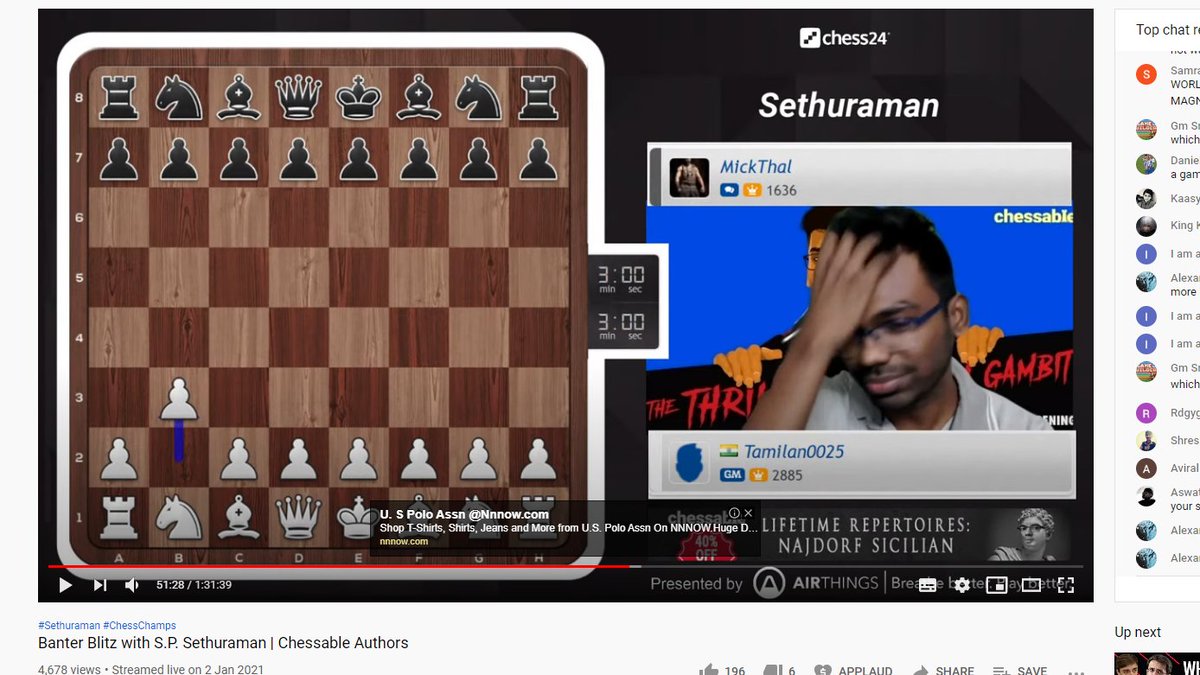 Sethuraman : OMG. What did I do? πŸ˜‚πŸ˜‚. I was supposed to promote my #ThrillingJaenischGambit. The cowboys will be happy though😈.Was a fun Banter Blitz yesterday @chess24com youtube.com/watch?v=Q1nPYd…