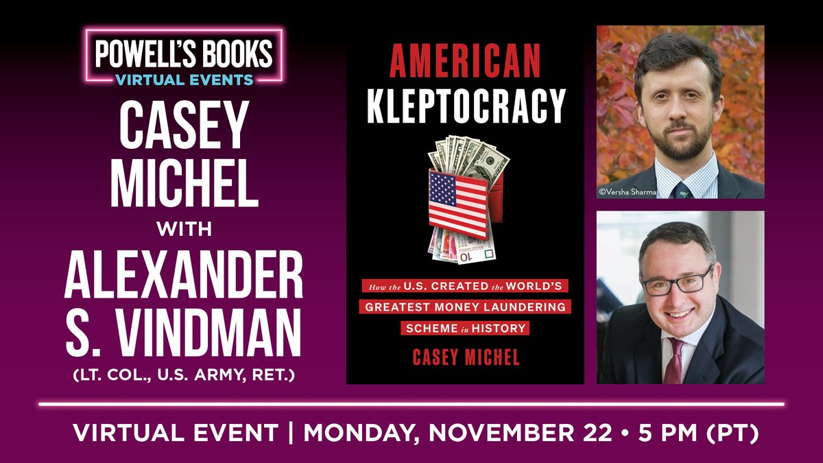 | TONIGHT (11/22) @ 5 pm (PT) — Casey Michel (@cjcmichel) examines just how the... Posted: 22 Nov 2021 09:20 AM PST TONIGHT (11/22) @ 5 pm (PT) — Casey Michel (@cjcmichel) examines just how the United States' implosion into a center of global offshoring took place in his new book, American Kleptocracy. In conversation @AVindman. RSVP: us06web.zoom.us/webinar/regist… This posting includes an audio/video/photo media file: Download Now |