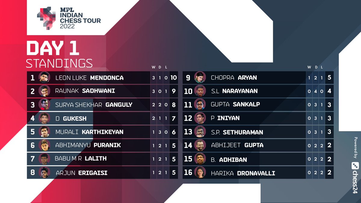 - MPL Indian Chess Tour Leg 1 Day 1: Leon Luke Mendonca takes sole lead...