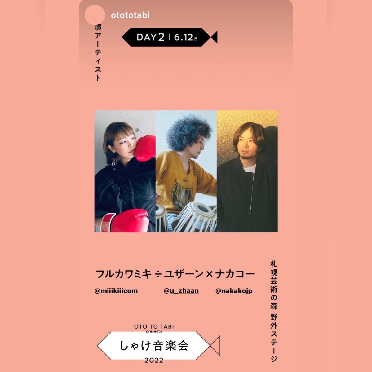 - ●LIVE● フルカワミキ÷ユザーン×ナカコー (mix: カミヤン) 6/12 OTO TO TABI presents「しゃけ音楽会 2022」 @ 札幌芸術の森 野外ステージ otototabi.com/shake2022/...