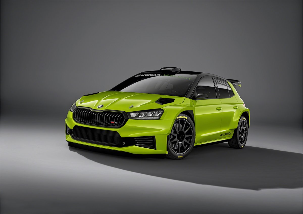 Aparte del alerón de techo de mayor longitud con aletas laterales, el nuevo #SKODA #FABIA RS Rally2 también cuenta con los estilizados faros delanteros del coche de producción que se extienden hacia la gran parrilla hexagonal de ŠKODA.
