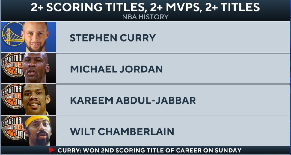 - Players in NBA history with 2+ scoring titles, 2+ MVPs, 2+ titles: Stephen Curry...