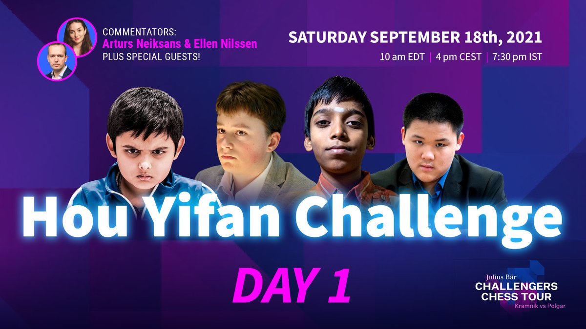 | I'm super excited for tomorrow and the next 4 days overall - some real... Posted: 17 Sep 2021 07:42 AM PDT RT @GMNeiksans I'm super excited for tomorrow and the next 4 days overall - some real action! :) #Chess24com @juliusbaer chess24.com : The world's youngest ever GM @ChessMishra joins @rpragchess, Vincent Keymer, Awonder Liang & co for the #HouYifanChallenge, the 4th event on the @juliusbaer Challengers Chess Tour, starting tomorrow! |