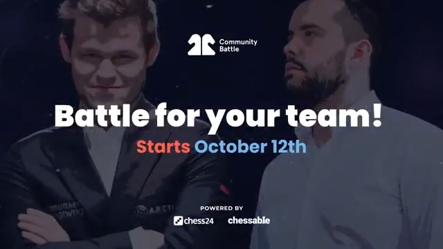 | BREAKING NEWS! Hey chess world - we're so excited to announce our FIRST EVER... Posted: 08 Oct 2021 05:12 AM PDT RT @chess24com BREAKING NEWS! Hey chess world - we're so excited to announce our FIRST EVER Community Battle! Register today to find out if you'll be Team Magnus or Team Nepo. Let's make some history before Dubai! Learn more: worldchesschampionship.live/community-batt… Your browser does not support the video tag. Click here to view directly. This posting includes an audio/video/photo media file: Download Now |