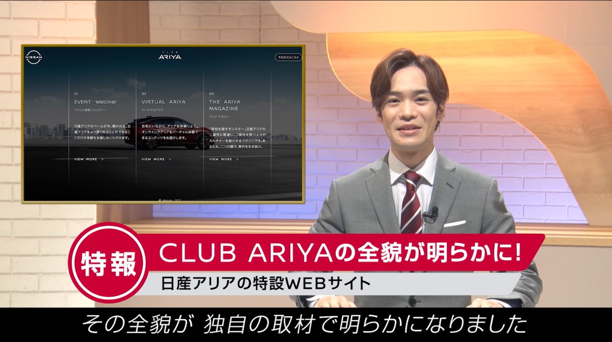 - 【 #おのけんナビ ARIYA特集3】 CLUB ARIYAの全貌が明らかになりました。 今回もニュースキャスターに扮した #小野賢章 さんが #日産アリア の情報をお届けします。 CLUB ARIYAの登録はこちら saas.nissan.co.jp/clubariya/...