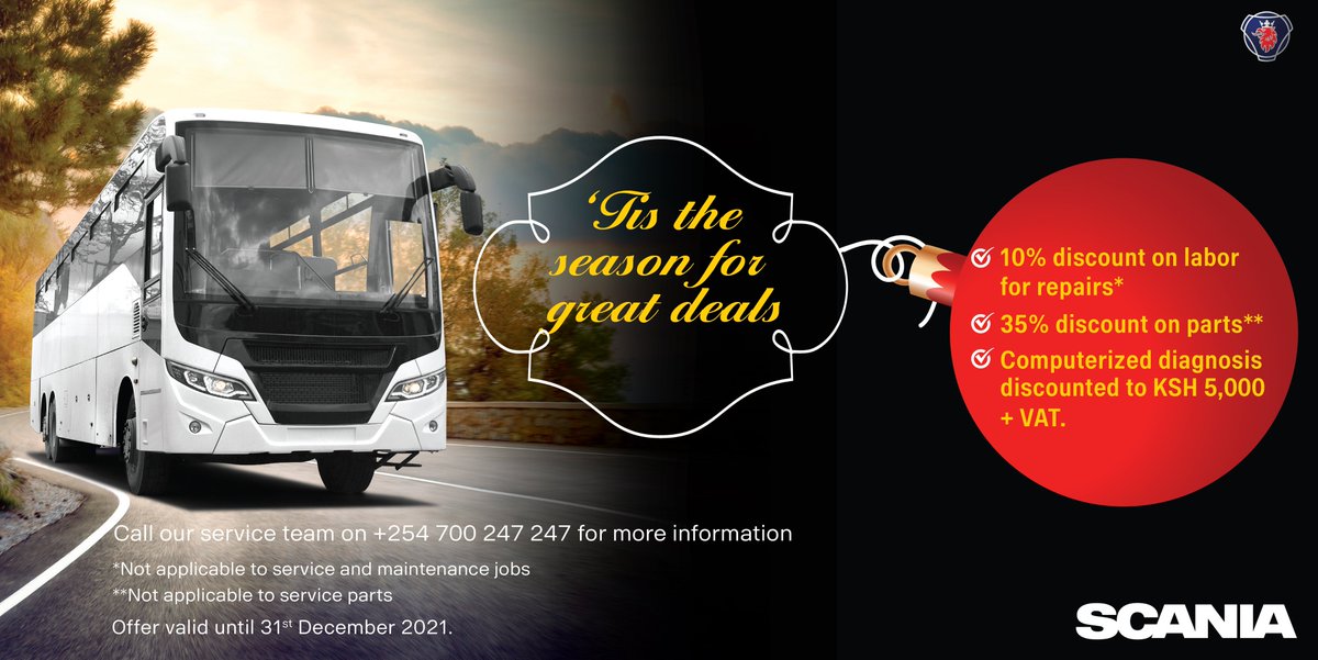 | 'Tis the season! Enjoy great deals on service, parts and diagnosis for your Scania... Posted: 06 Dec 2021 03:51 AM PST 'Tis the season! Enjoy great deals on service, parts and diagnosis for your Scania bus at our workshops in Nairobi, Mombasa, Eldoret, and Nakuru. For more information please get in touch with our service teams on +254 700 247 247. This posting includes an audio/video/photo media file: Download Now |