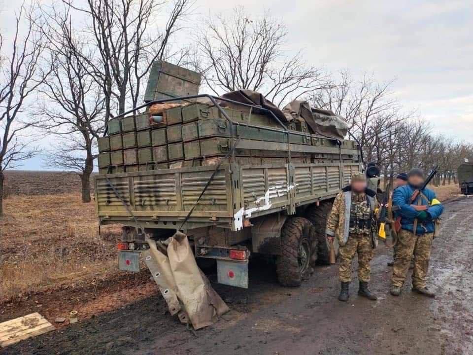 - Fighters of the territorial defense forces next to their trophy.