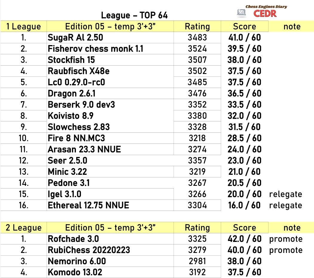 - Chess Engines Diary League GUI-Fritz 17, Fritz 15 and Arena, Time: 3'+3" More: chessengines.blogspot.com/2022/07/chess-…