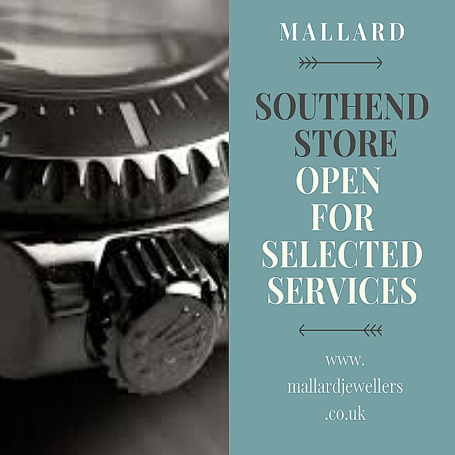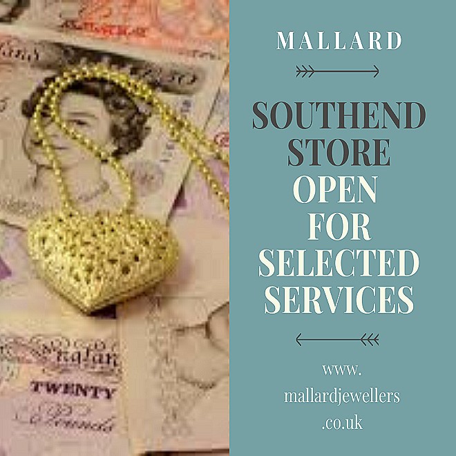 On Tuesdays services will be buying gold, pawnbroking, deposits, collection of complete repairs & viewings by appointment only. Please contact us for details on 01702 460401 on Tuesdays. Open 9am-3pm. Online retail shopping mallardjewellers.co.uk