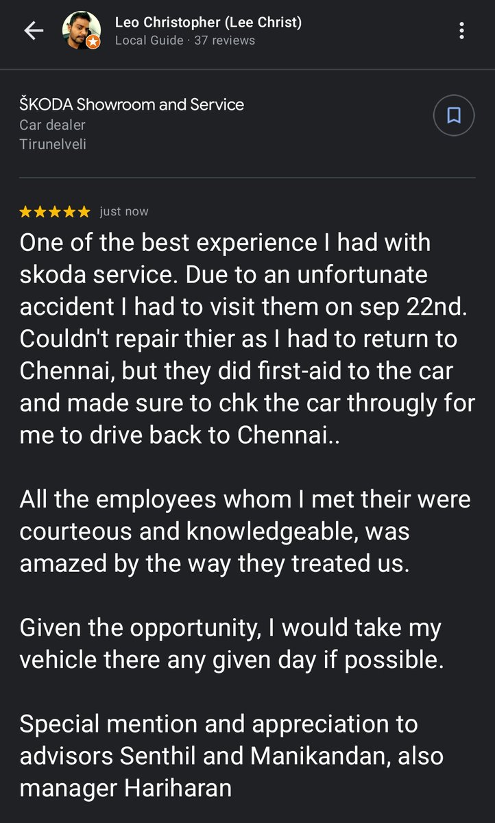 | This is indeed worth a shout-out! Thanks for acknowledging the efforts @LeoChrisJ1 Posted: 20 Oct 2021 12:47 AM PDT This is indeed worth a shout-out! Thanks for acknowledging the efforts @LeoChrisJ1 Leo Chris J: @SkodaIndia #Auraskoda #Thirunelveli @Zac_Hollis_ These guys are gem. Advisors Senthil, Manikandan and manager Hari they deserve a raise. Please pass on my appreciation to them, couldn't find their twitter handle. #Skodaforlife ❤️❤️✌️✌️ |